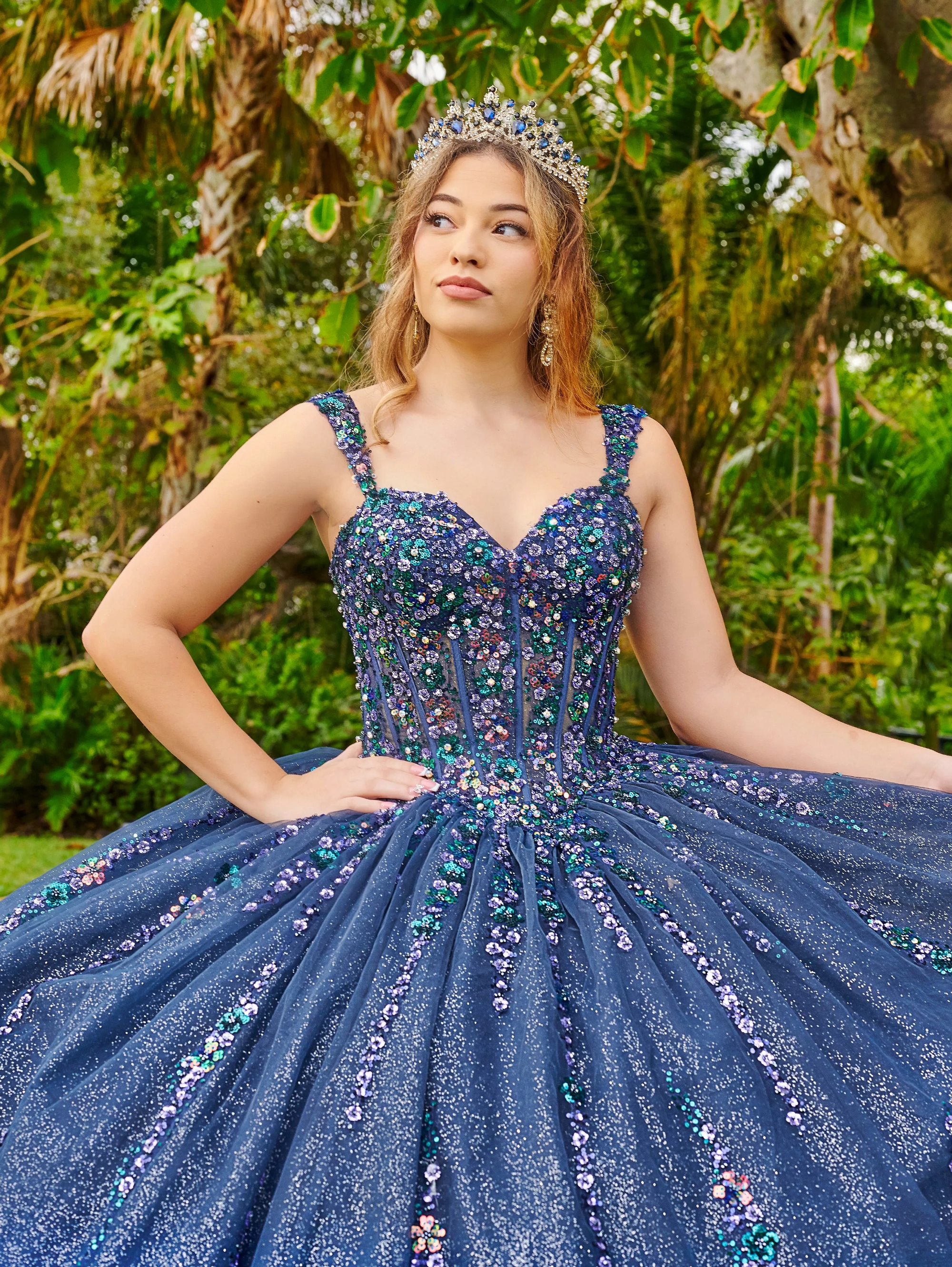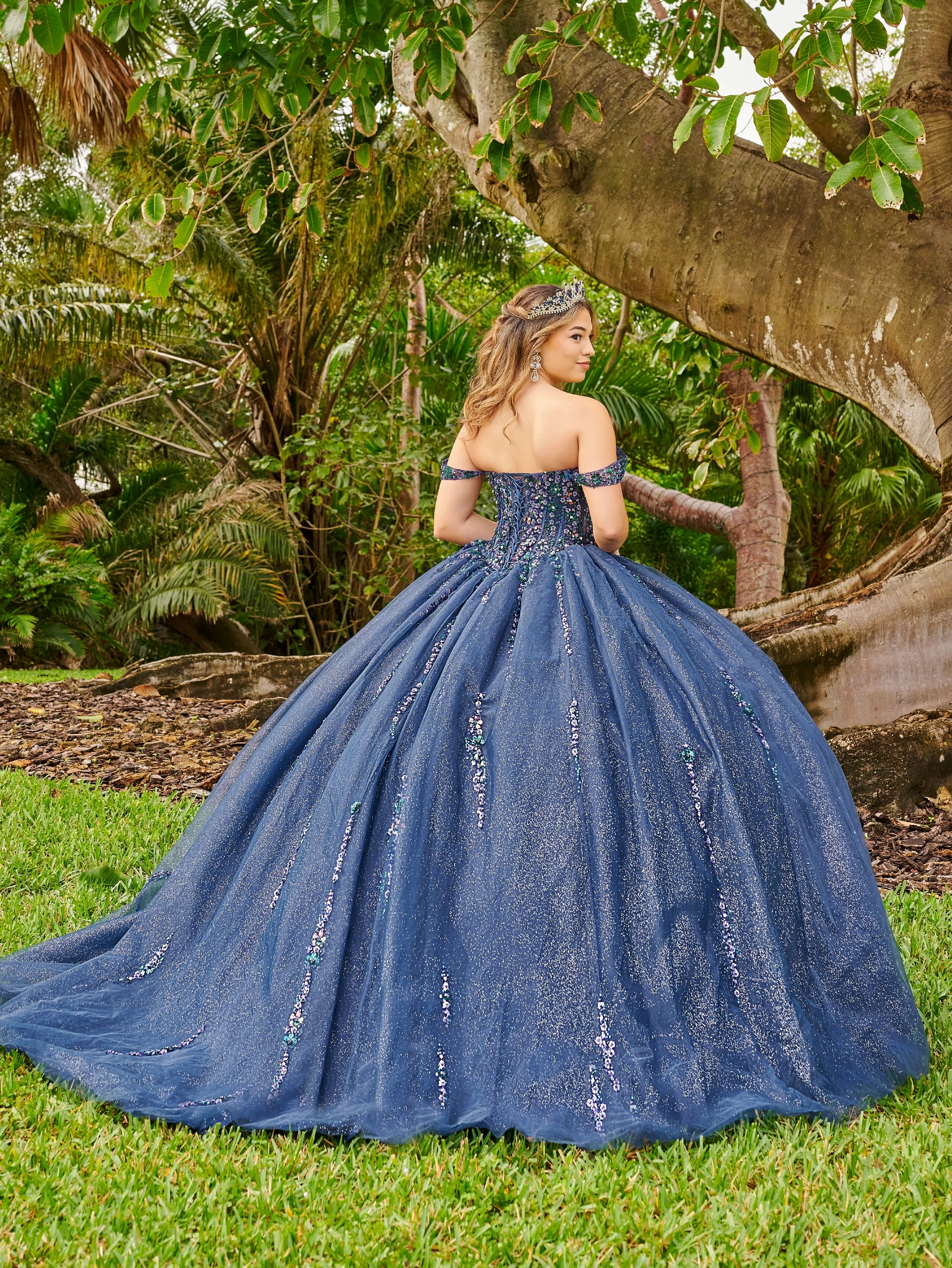 This gorgeous quinceanera ball gown features a fully beaded corset bodice adorned with delicate three-dimensional floral embroidered appliqués. The delicate off-the-shoulder straps draped softly around the arms. The glitter tulle skirt adds the perfect sparkle to complete this look.