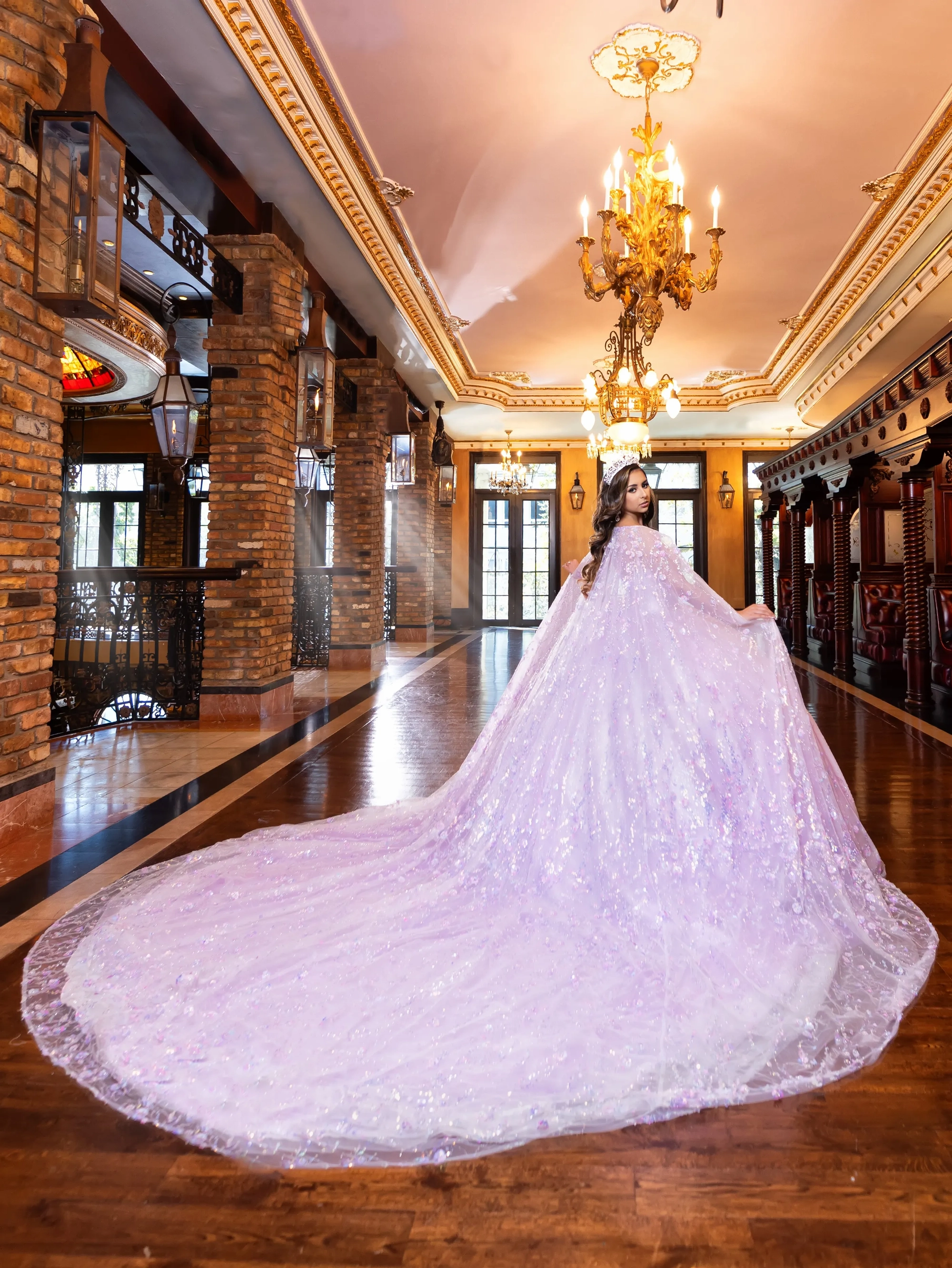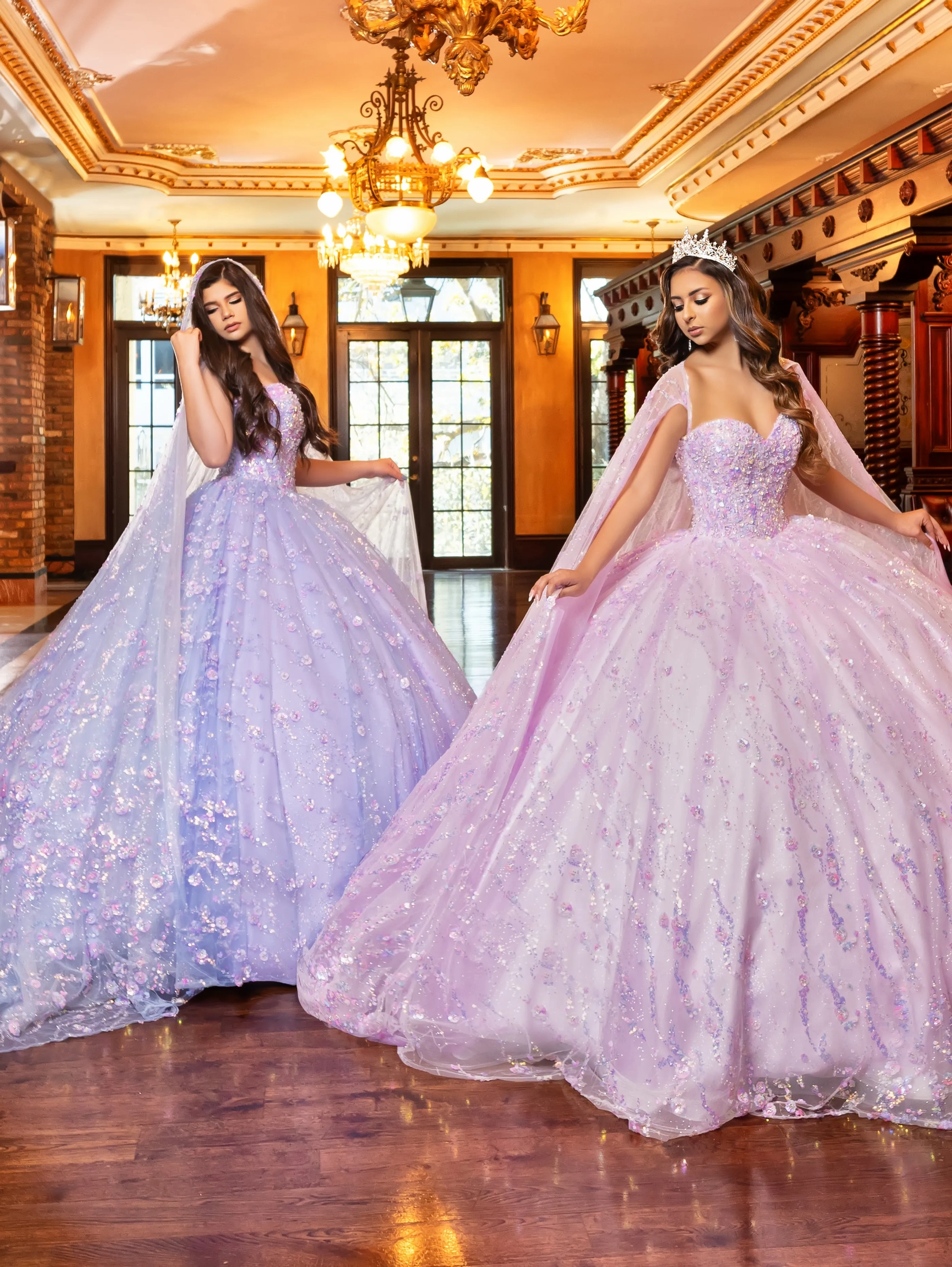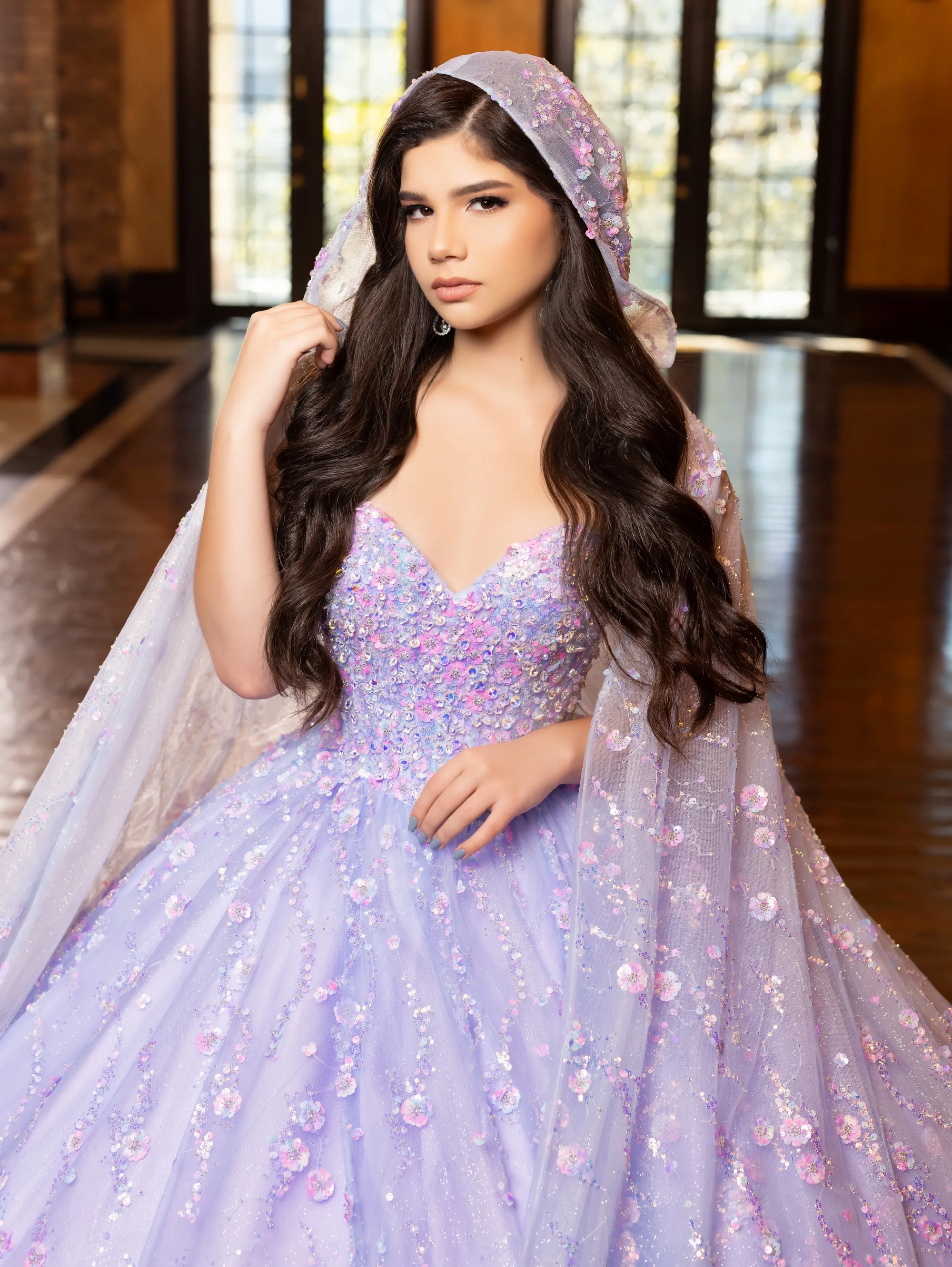 This Quinceanera dress is a fairytale-inspired gown that would be perfect for a garden-themed event. The sweetheart bodice is adorned with three-dimensional floral appliques in pastel colors that flow down the glittery tulle skirt. A unique touch is added with a beautiful sheer hooded cape. The gown is completed with a royal train, making it a stunning and regal choice for any Quinceanera.