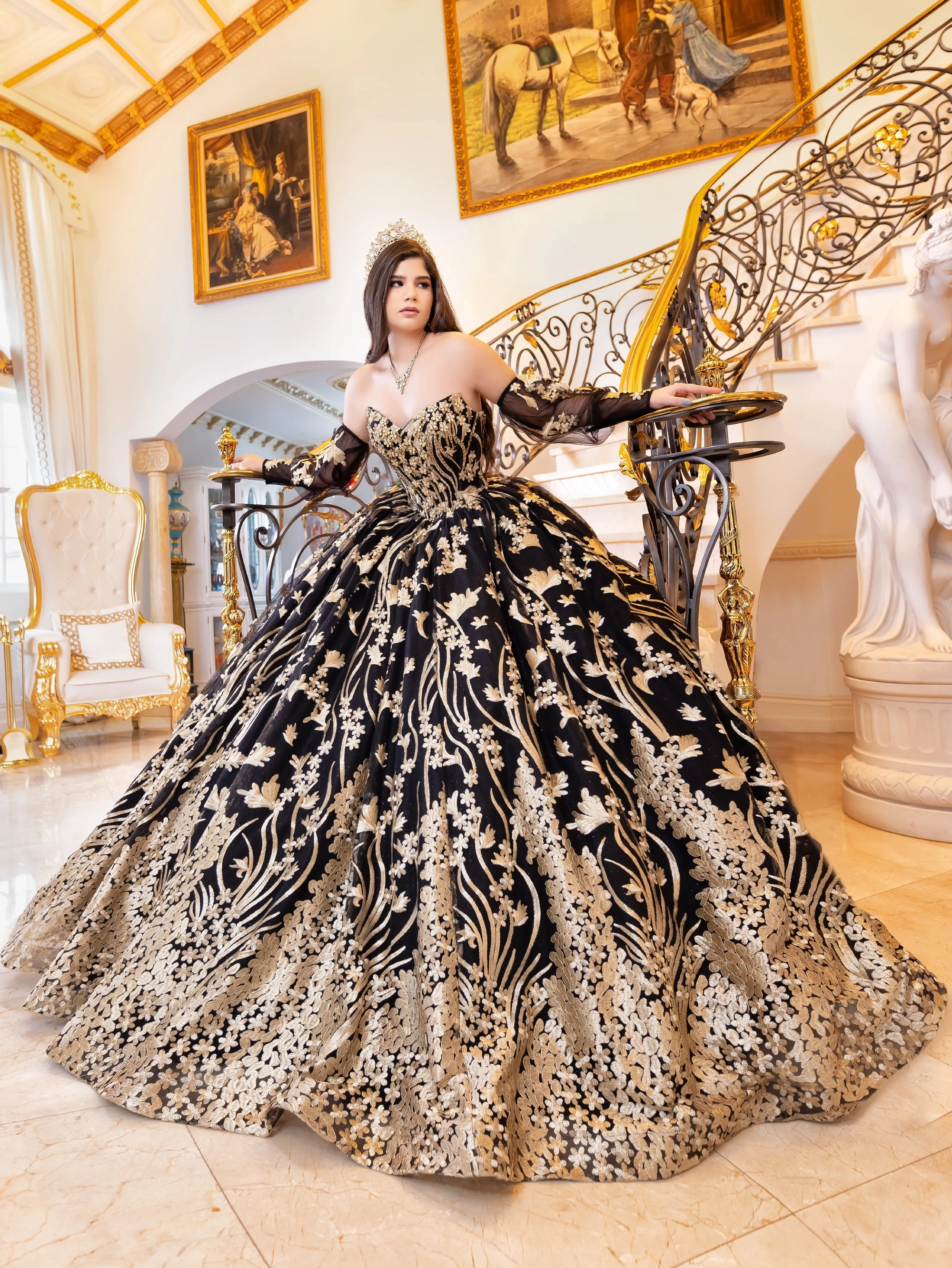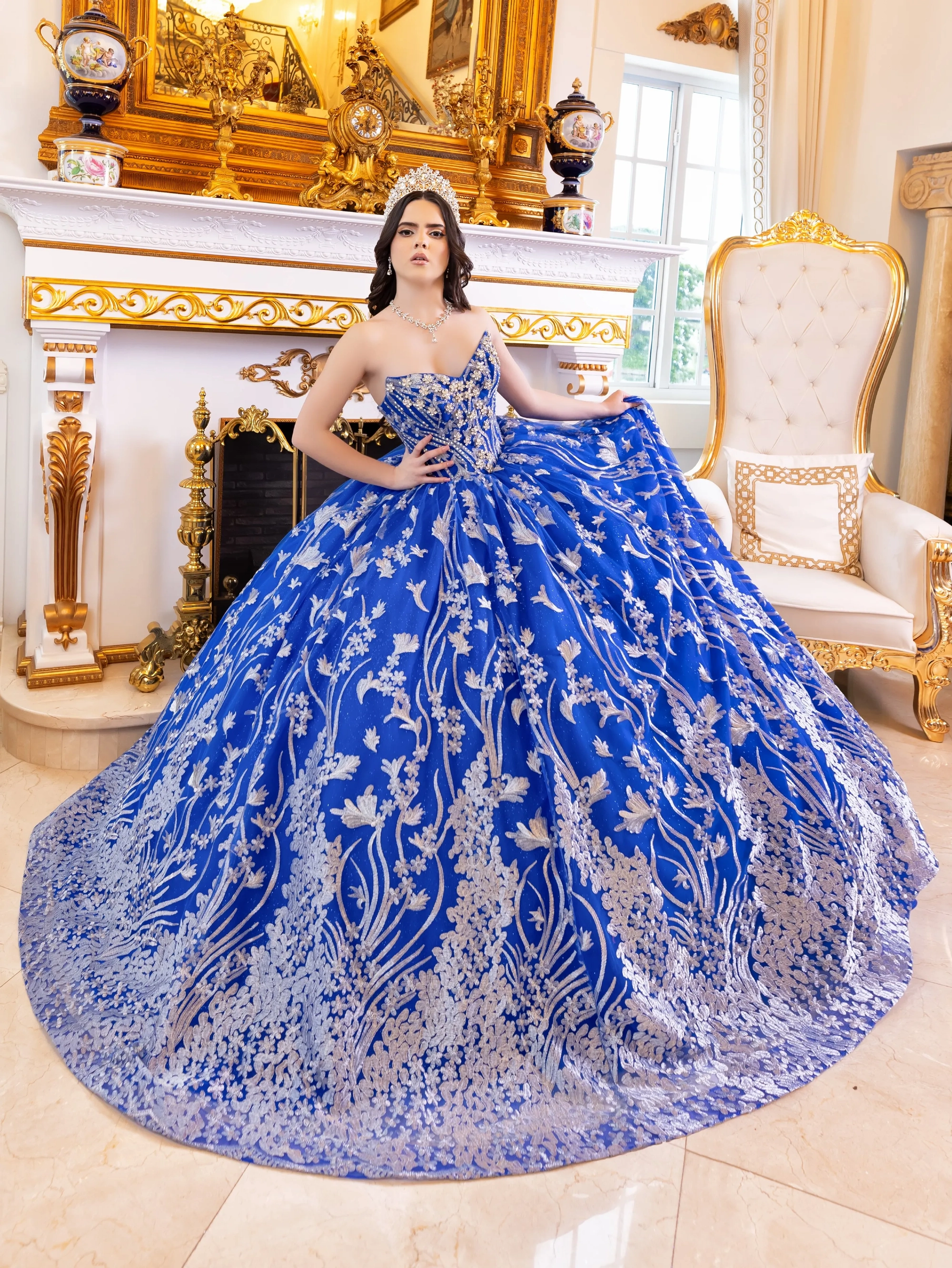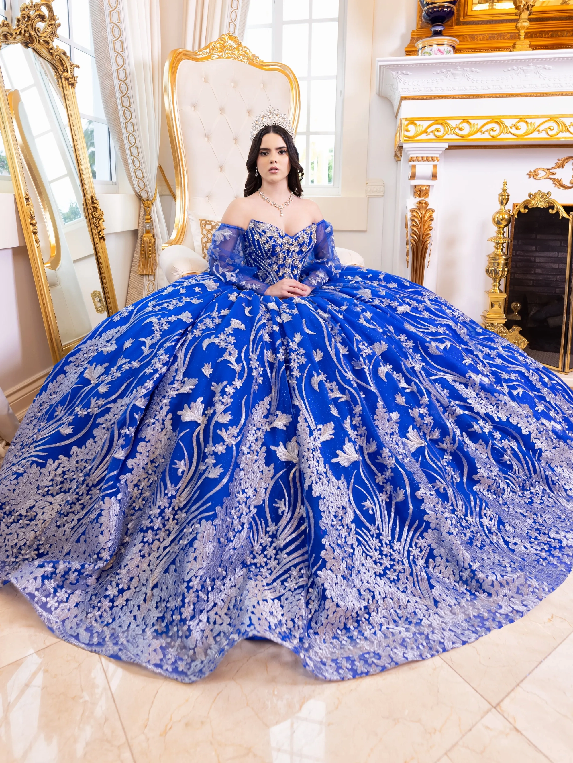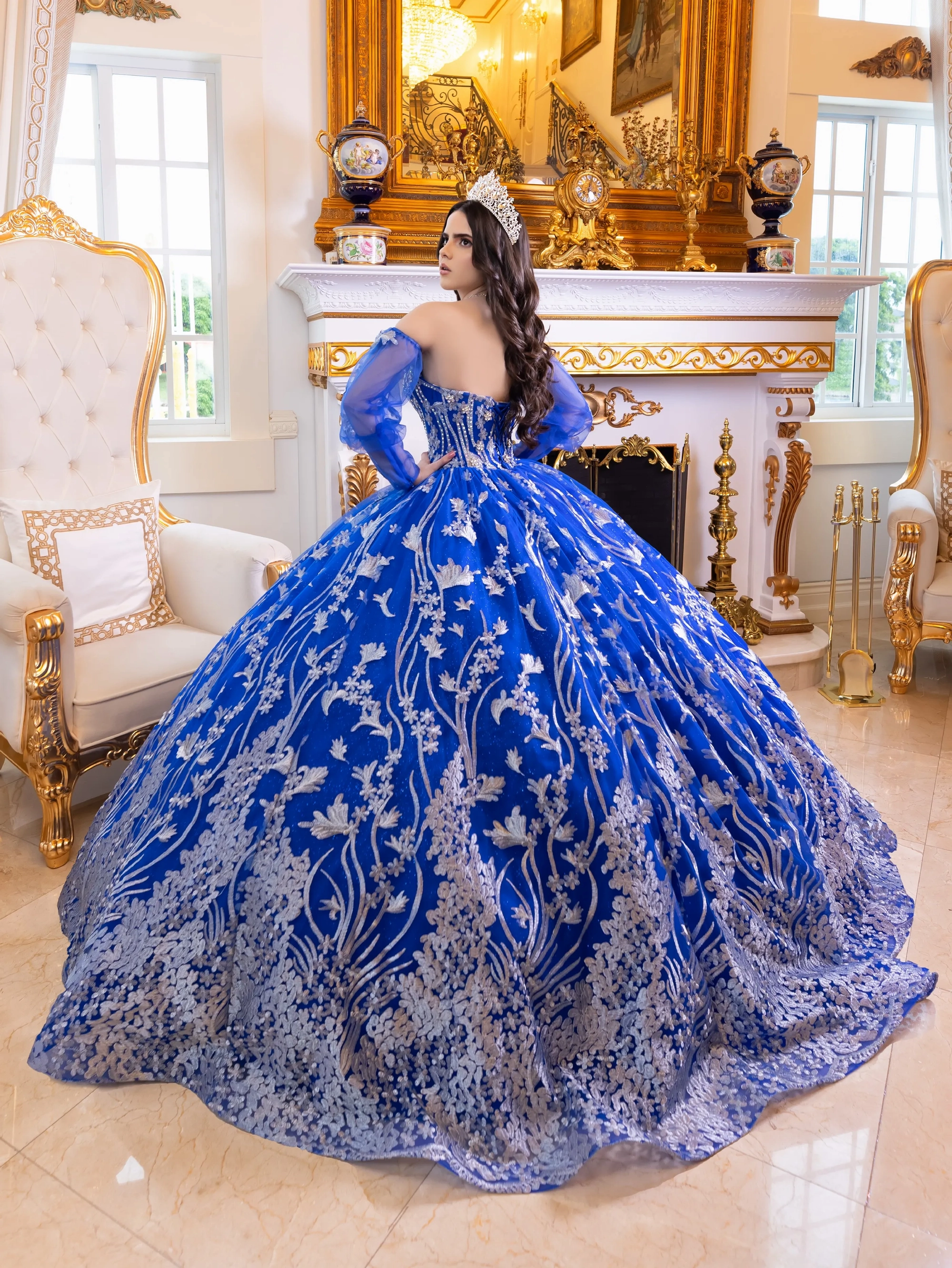 This stunning Quinceanera gown features intricate lace detailing all over the dress, blending classic design elements with modern style. The sweetheart neckline is embellished with large, sparkling flower jewels that add a 3-dimensional effect. The dress is designed with bishop sleeves for a unique touch, and the back is corseted for a perfect fit. The dress also features a dramatic long train that adds to the overall elegance of the gown.