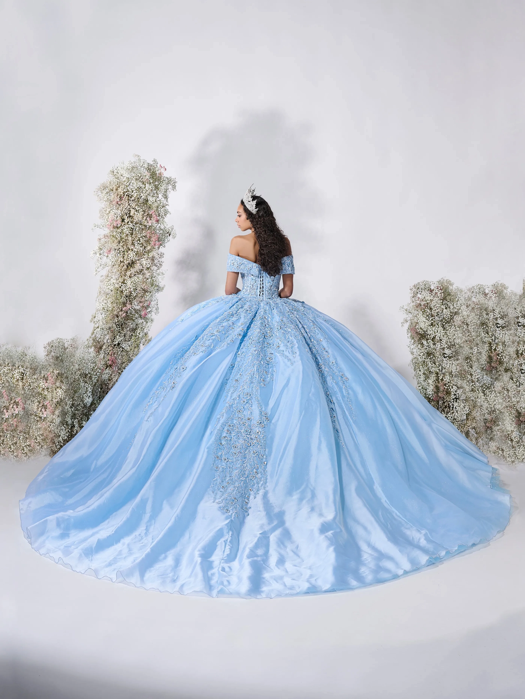 Float into your special day in this enchanting ball gown, crafted from luxurious chiffon organza for an ethereal, lightweight feel. The elegant portrait collar frames the neckline beautifully, while the voluminous skirt flows into a grand train for a breathtaking finish. Chiffon Organza